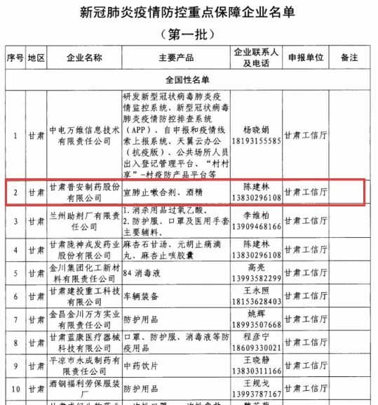 喜訊:甘肅普安制藥股份有限公司榮列國家新冠肺炎疫情防控重點保障企業(yè)名單(第一批)