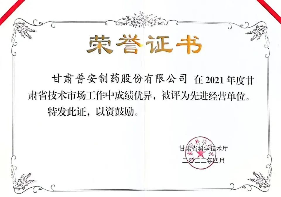 日前,甘肅省科學技術(shù)廳通報了2021年度甘肅省技術(shù)市場先進經(jīng)營單位,集團公司所屬企業(yè)甘肅普安制藥股份有限公司(以下簡稱“普安制藥”)榮獲2021年度全省技術(shù)市場工作先進經(jīng)營單位。
