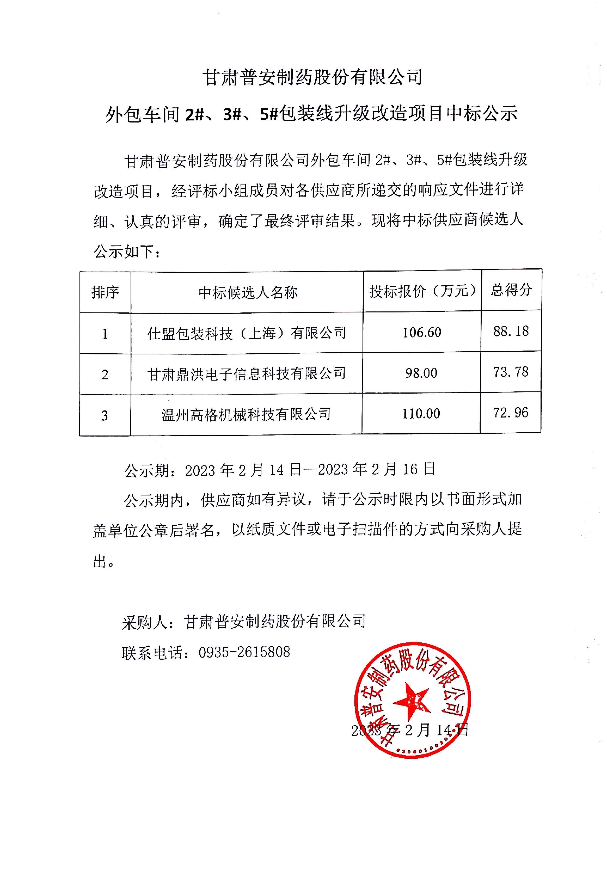 甘肅普安制藥股份有限公司外包車間2#、3#、5#包裝線升級改造項(xiàng)目中標(biāo)公示