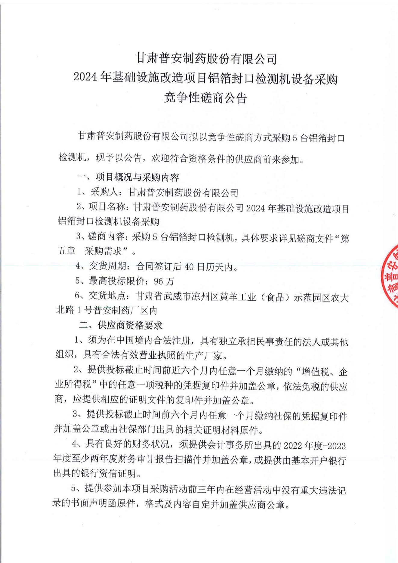 甘肅普安制藥股份有限公司2024年基礎(chǔ)設(shè)施改造項目鋁封口檢測機設(shè)備采購競爭性磋商公告