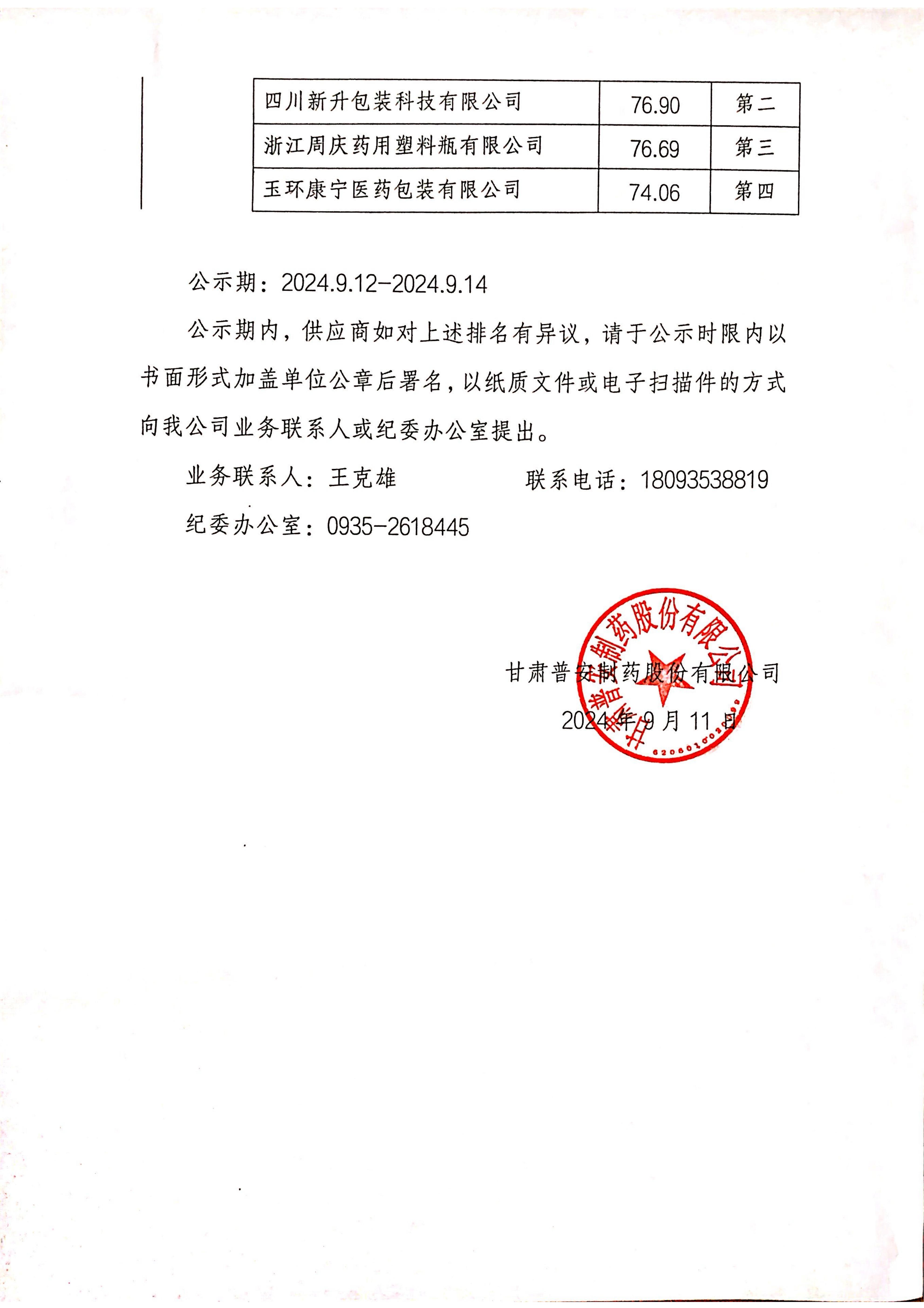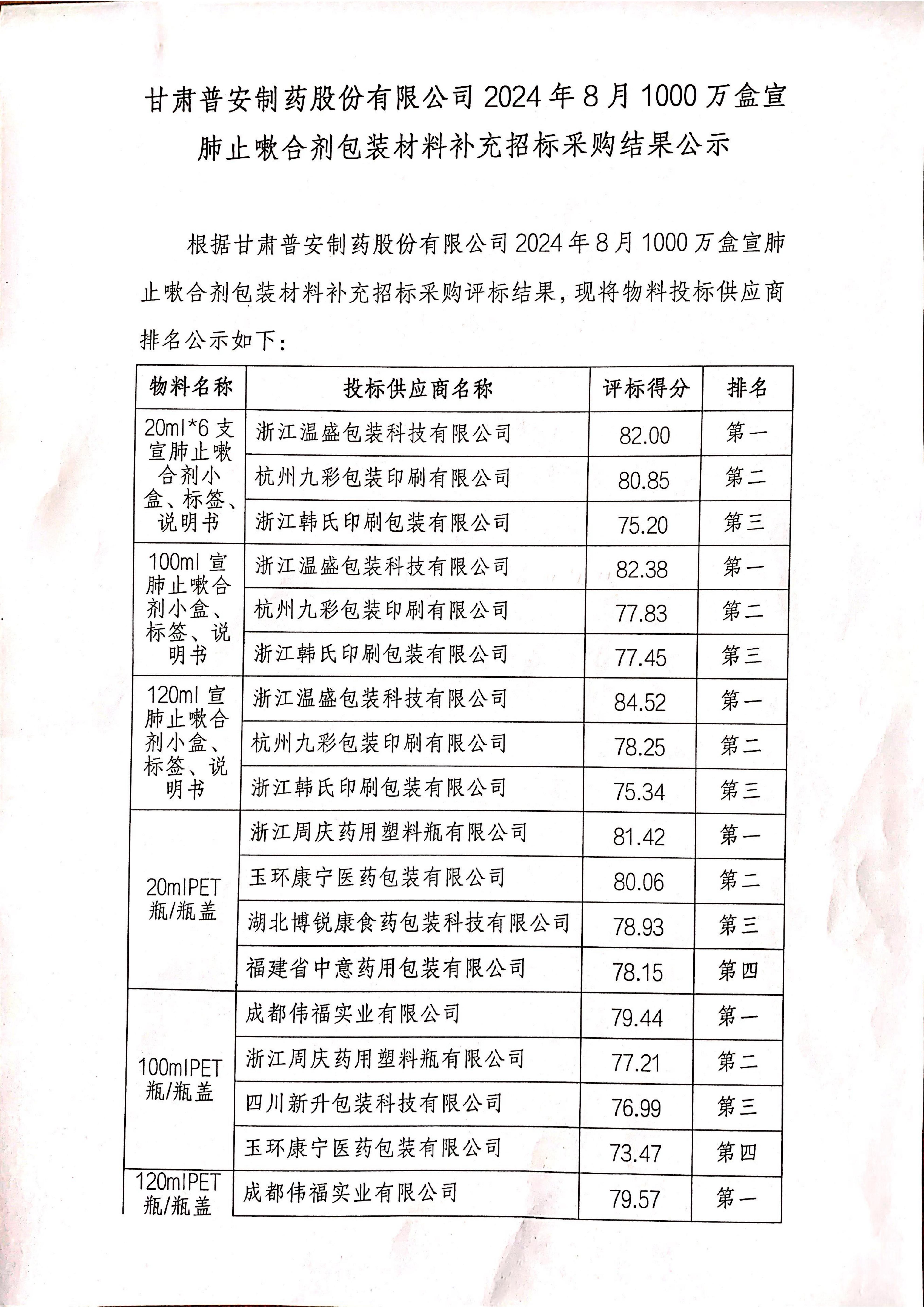 甘肅普安制藥股份有限公司2024年8月1000萬盒宣肺止嗽合劑包裝材料補充招標采購結(jié)果公示